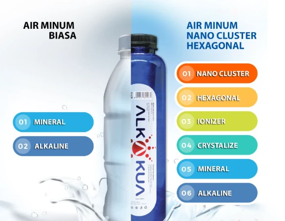 Air Nano Hexagonal kami memiliki manfaat kesehatan karena diolah dengan 6 teknologi canggih dan modern, sehingga dapat menggabungkan 6 partikel penting yang dapat meningkatkan imun tubuh, terutama untuk penderita diabetes, kolesterol, dan asam urat.